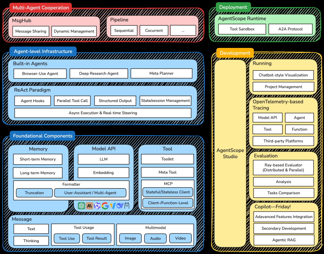 Agentscope 的核心定位是 “企业级多智能体开发框架” —— 通过封装多智能体协作的共性能力,提供标准化架构范式,让开发者无需从零搭建架构,仅需聚焦 “业务逻辑定义”,即可快速落地生产级多智能体应用。其架构设计遵循 “模块化、可插拔、易扩展” 三大原则,兼容主流大模型(通义千问、GPT、DeepSeek 等)、工具协议(MCP、Function Call)与存储系统(向量库、知识图谱),覆盖从 “原型验证(POC)” 到 “规模化部署” 的全生命周期。