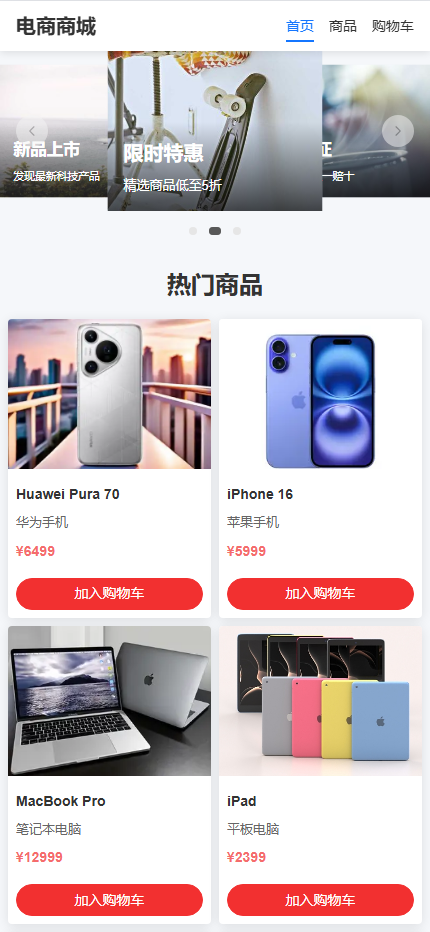 本实验就带大家亲自动手实操,借助 OpenTiny NEXT 提供的工具,将一个传统 Web 应用转变成智能应用,体验让 AI 智能体代替人操作 Web 应用。我们提供了一个传统的电商网站示例项目,该项目主要包含电商商城前端应用、电商后台管理系统、电商后端三个部分,前端项目基于 Vite + Vue3 + TinyVue 技术栈,后端项目基于 Express。shop 电商商城前端应用,给终端用户