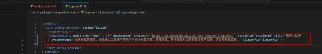 (1)创建 MCP Server 修改 Products.vue 在 shop->packages->shop-admin->/src/views/Products.vue 文件中加入以下代码: