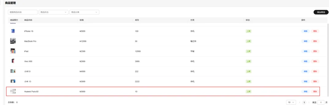 除了添加商品功能,还可以编辑和删除,因功能较为简单,此处不再赘述,开发者们可以根据自己的需求进行测试和二次开发。