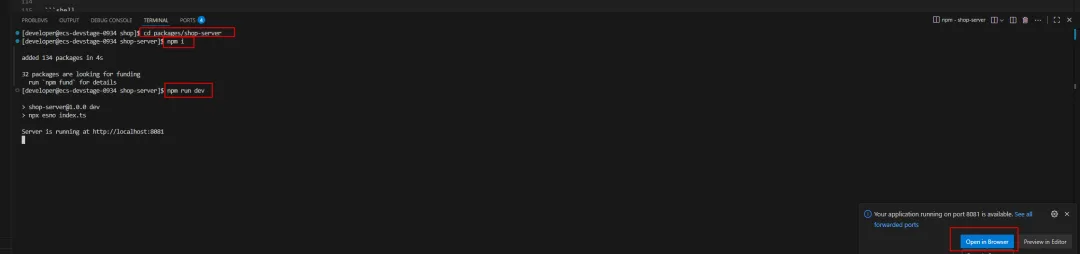 注:若是没有自动打开浏览器访问,或者右下角也没有 "Open in Browser" 字样,我们还可以通过电商商城前端应用,电商后台管理系统此连接进行访问。