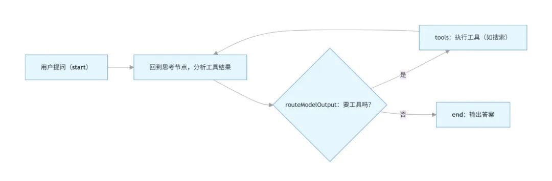 先记住一个核心逻辑:整个智能体就是 “循环做 3 件事”—— 思考→判断要不要用工具→用工具 / 输出答案。