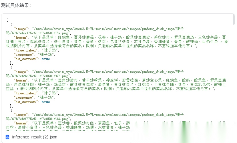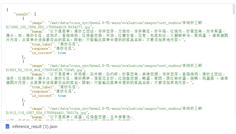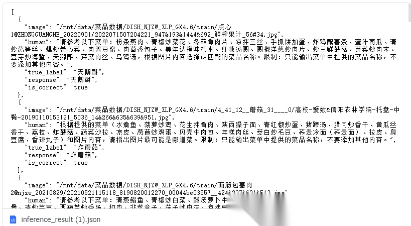 根据Qwen2.5-vl官方的训练示例以及大模型训练的相关范式,将上述数据构建为两种类型的数据: 第一类:只提供一张菜品图片,让模型识别图片对应的菜品名,数据示例: