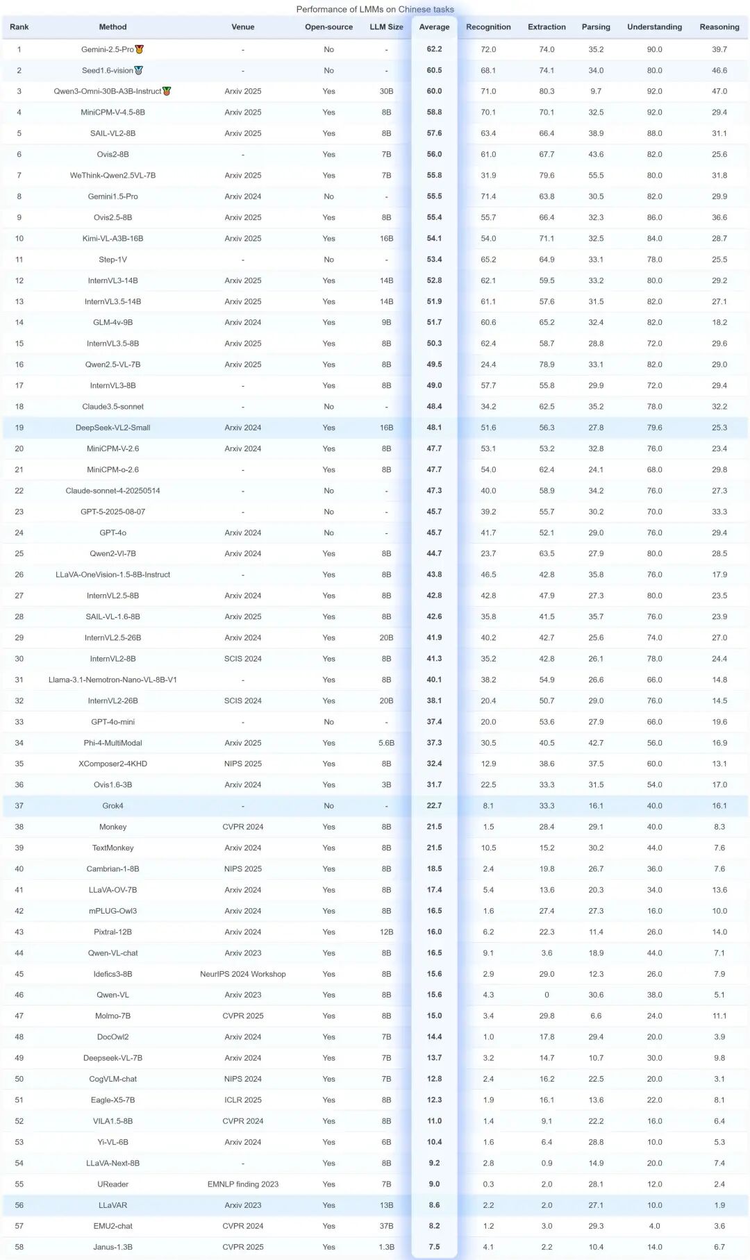 而开源阵营中,Qwen3-Omni-30B-A3B-Instruct分别取得英文榜第二名和中文榜第三名的好成绩,此外,InternVL、Qwen-VL、SAIL-VL、Ovis等系列国产模型也表现突出,与顶尖模型差距不大。