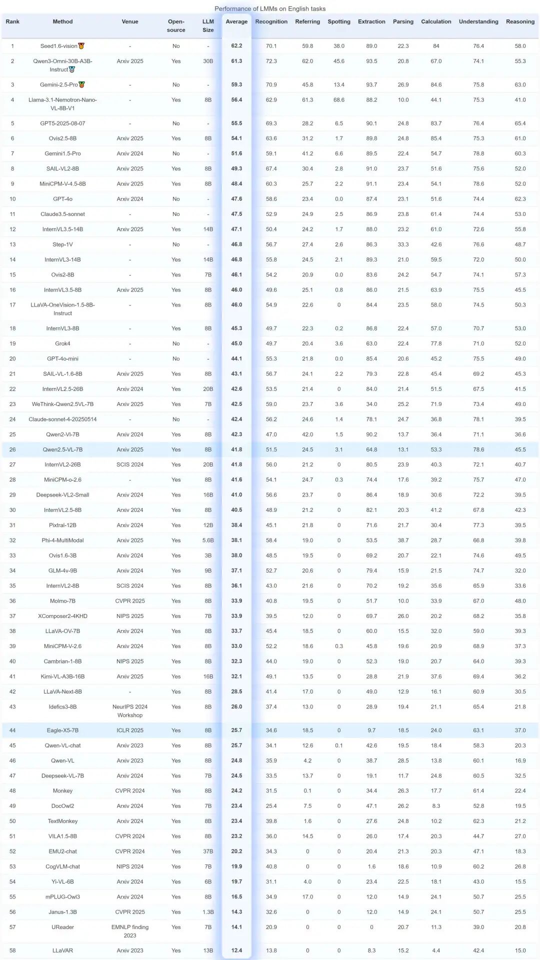 此外,各个模型的擅长方面也略有不同,例如Gemini-2.5-Pro等商用模型在计算类题目上,具有明显优势,展示出其强大逻辑推理能力;Llama-3.1-Nemotron-Nano-VL-8B-V1则凭借其强大的文字定位能力,取得英文榜单第四名的成绩。而大多数模型在基础的文本识别上表现尚可,但在文本定位(Referring)、文本检测识别(Spotting)和元素解析(Parsing)等对细粒度空间感知与结构化理解要求高的任务上,得分普遍偏低。例如,即使是榜单冠军Seed1.6-vision,在Spotting得分也仅为38.0,这也限制了其在场景文字、图文混杂文档等真实场景下的应用效果。