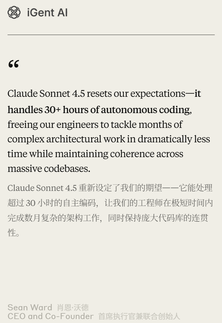 Claude Code能自主编程30小时以上,帮助工程师在极短时间内完成原本要花费数月的架构工作。——Sean Ward, iGent AI CEO