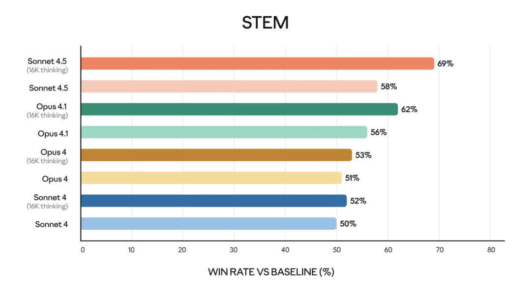 在过去半年中,Claude团队不断迭代Claude Code,探索了智能体设计中的核心挑战,包括长时任务的内存管理、权限体系的平衡,以及子代理的协同方式。在这一体验中,Claude会实时生成软件,没有预设功能或预写代码,用户可以直接看到Claude在交互过程中即时创造与适配的过程。在一系列公共评测中大幅领先,特别是在金融、法律、医学和STEM等专业领域的知识与推理上,远超此前的Opus 4.1。在