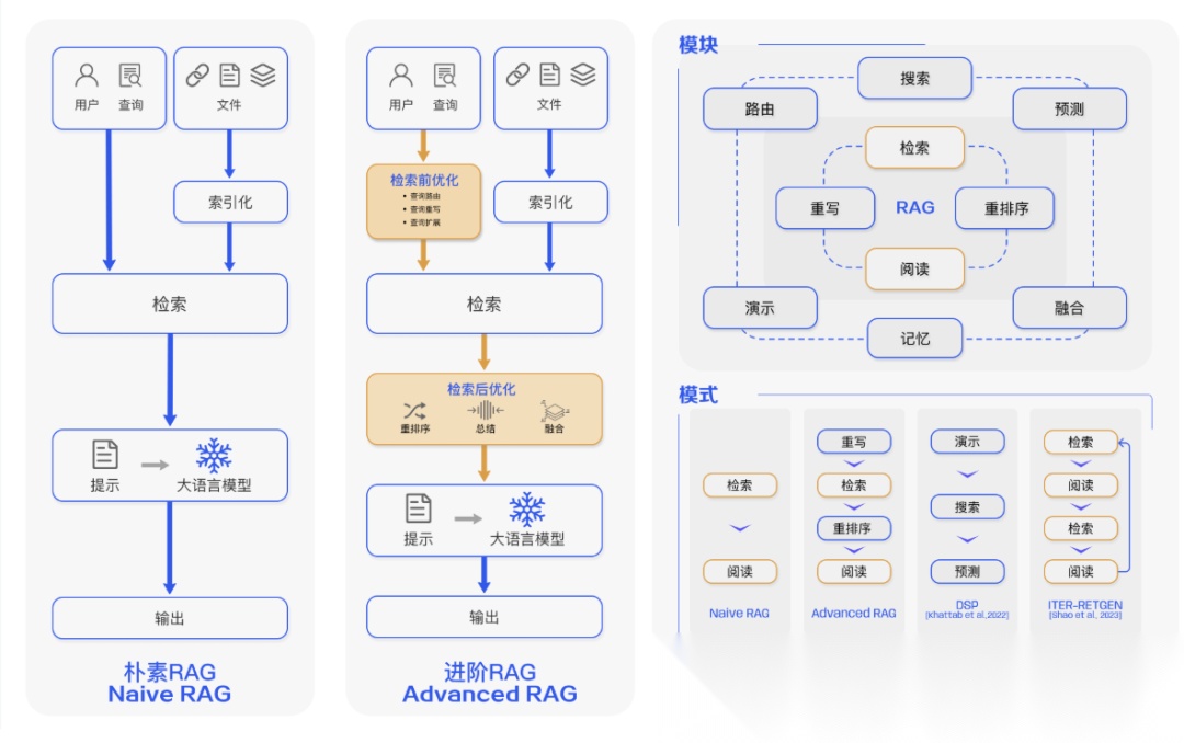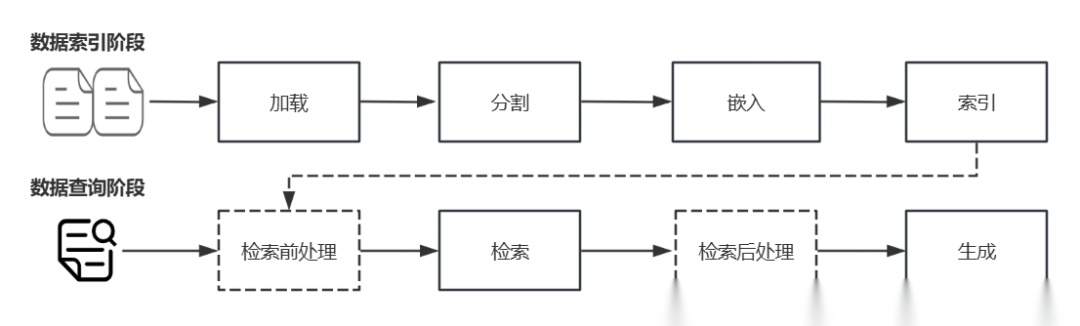 以上是一个经典 RAG 应用所包含的主要阶段。随着 RAG 范式与架构的不断演进与优化,有一些新的处理阶段被纳入流程,其中典型的两个阶段为检索前处理与检索后处理。