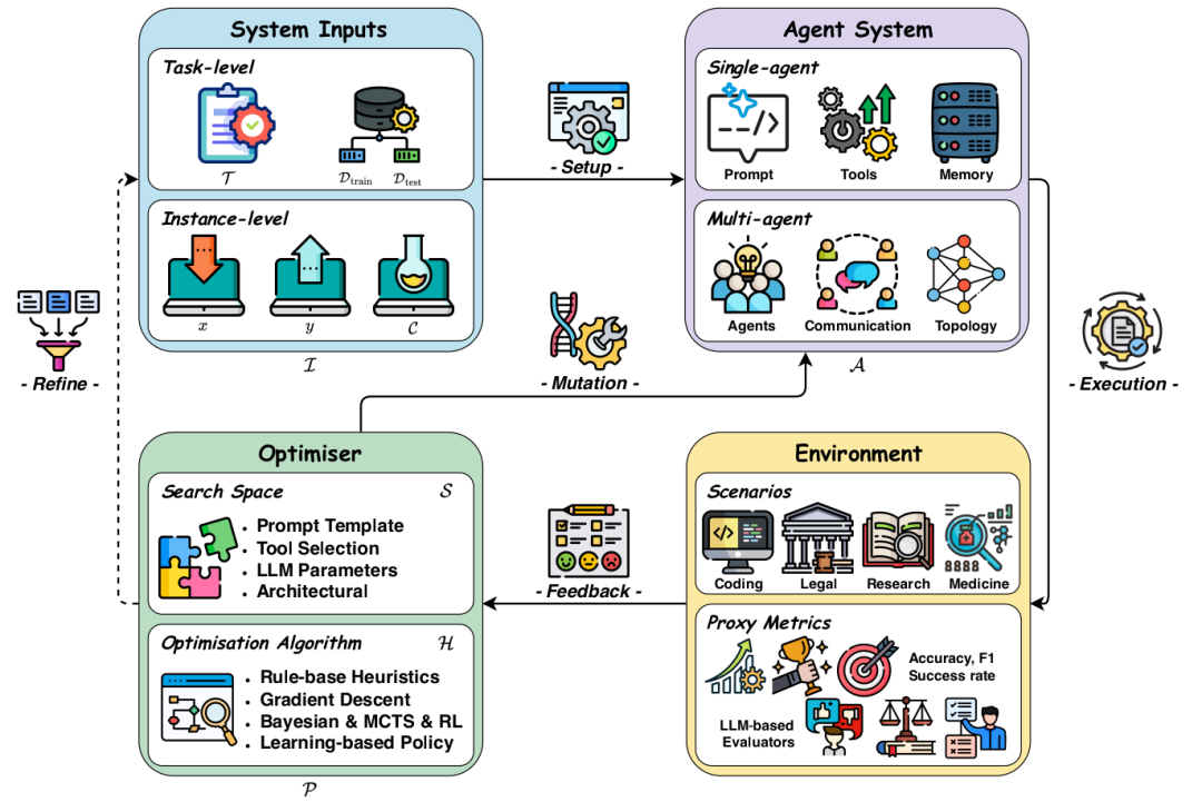 - 优化器(Optimizer):根据反馈调整智能体配置。