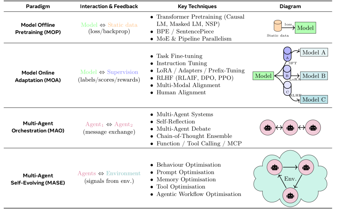- 建立四阶段范式演进模型(MOP→MASE),揭示从静态模型到自进化系统的路径;