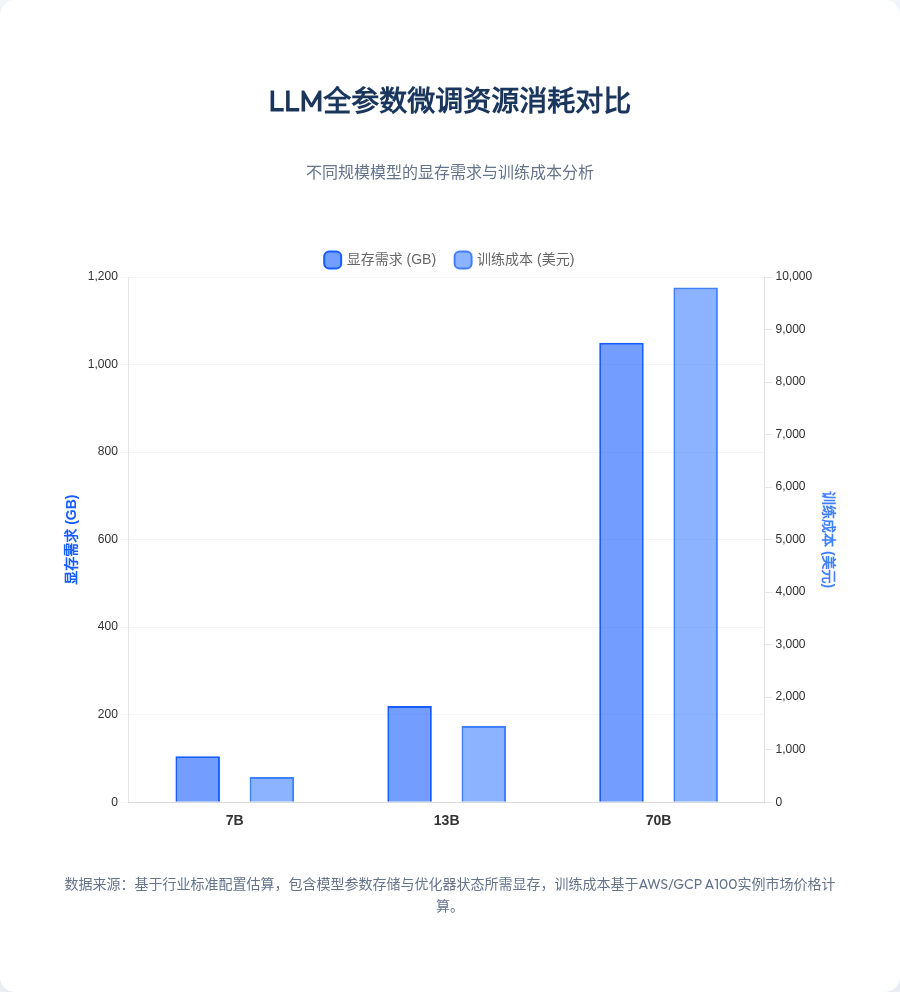 全参数微调需更新模型所有参数(如 GPT-3 的 175B 参数),导致其对计算资源的需求呈指数级增长。以主流开源模型为例,不同参数量级的模型在微调过程中表现出显著的资源差异: