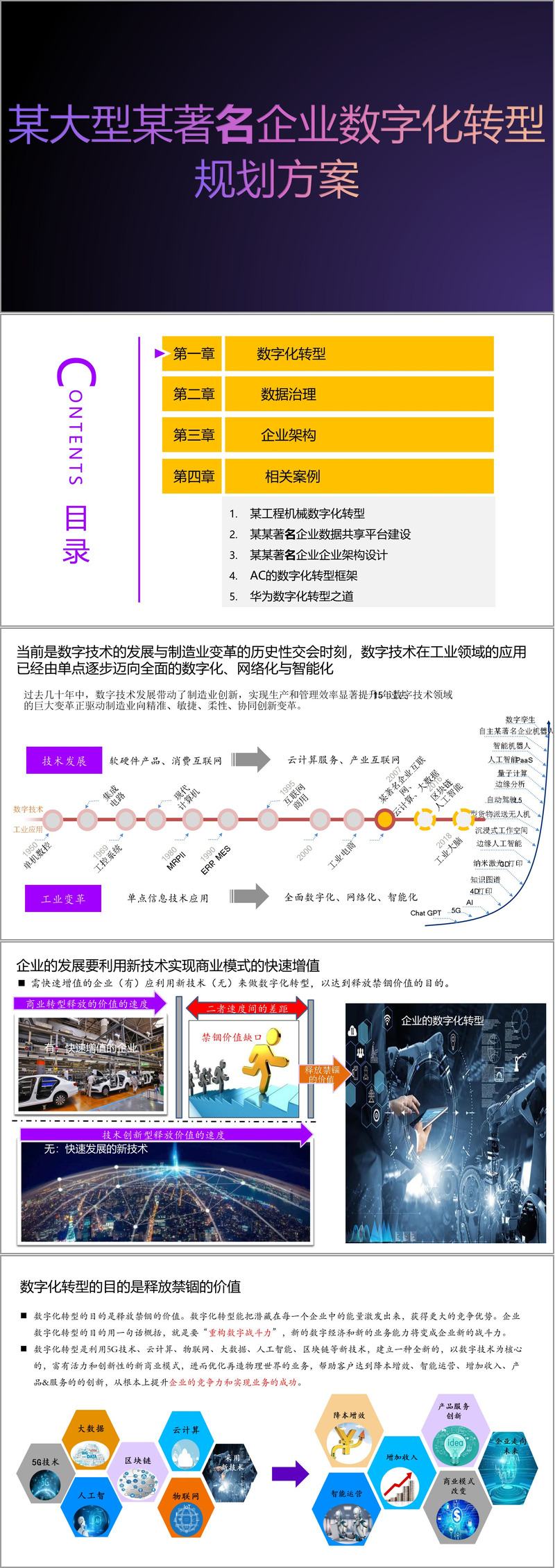 在开篇,规划点明了数字化转型的迫切性。当下,数字技术与工业变革深度融合,企业已不能满足于单点的 IT 应用,全面的数字化、网络化、智能化转型势在必行。转型的核心目标是释放企业被禁锢的价值,重构数字战斗力,借助新技术打造创新商业模式,以此提升竞争力与业务成效。
