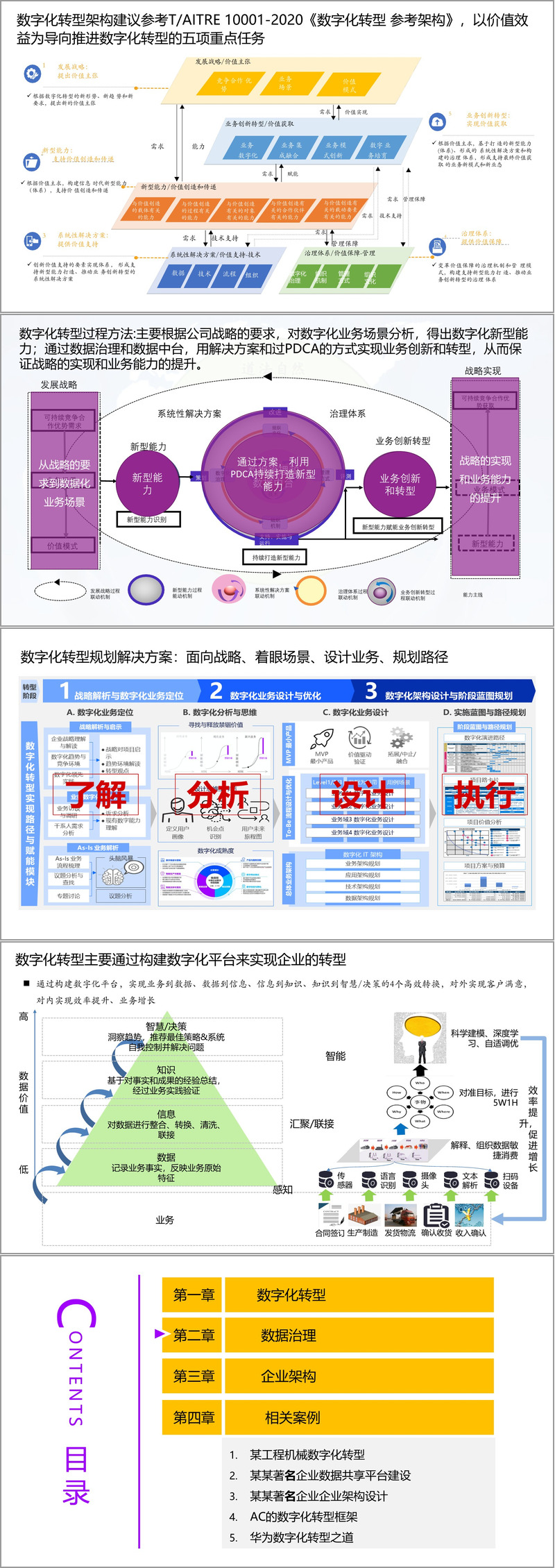 规划中还列举了多领域企业的转型案例,为实践提供了丰富的参考。柳工以战略为引领,在数据治理、中台搭建、业务协同及架构完善等方面积极探索,推动业务与数字的深度融合;某央企通过规范构建、主题库建设及平台搭建,成功攻克数据孤岛与质量瓶颈;华为的数字化转型成果显著,凭借明确的目标指引、意识文化与方法模式的多元转变、特色框架及流程方法的支撑,在用户体验、效率提升、模式创新等方面收获颇丰,为众多企业树立了标杆典范。