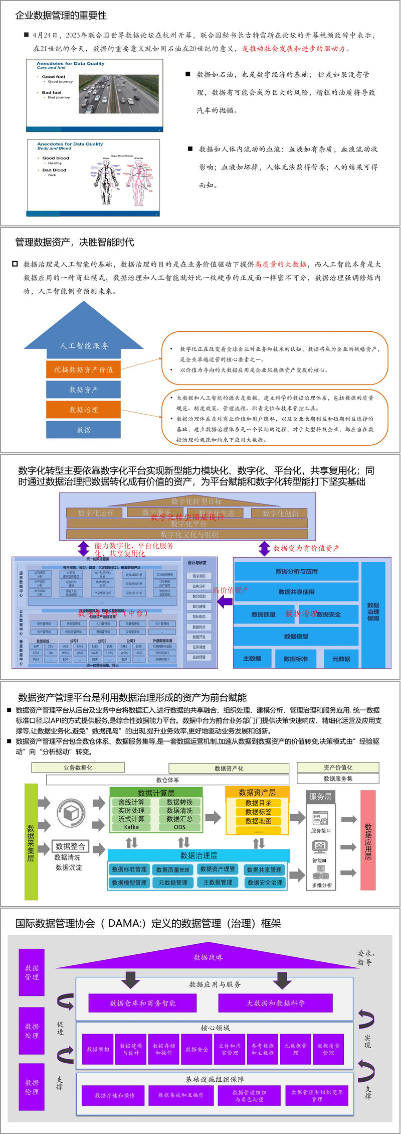 数据治理在整个转型中占据核心地位。数据作为数字经济的基石,其重要性堪比石油,但需要精细管理。数据治理与人工智能紧密相关,构建科学的数据治理体系,涵盖多种管控工具,能为企业数据资产增值奠定基础,也为数字化平台筑牢根基,助力数据向资产的跃升,进而驱动业务的发展与创新。
