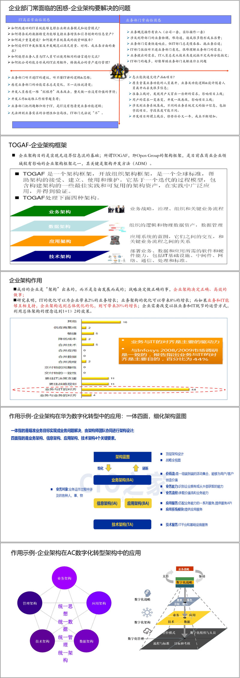 企业架构在解决企业运营困境方面发挥着重要作用。以 TOGAF 框架为例,它通过架构开发方法(ADM)优化业务与 IT 的协作。从华为、AC 等企业的成功案例中可以看出,架构在转型中能够优化业务流程、整合数据信息、支撑决策,提升企业内部的集成度与协同效率,在企业数字化转型的各个环节发挥着核心推动作用。