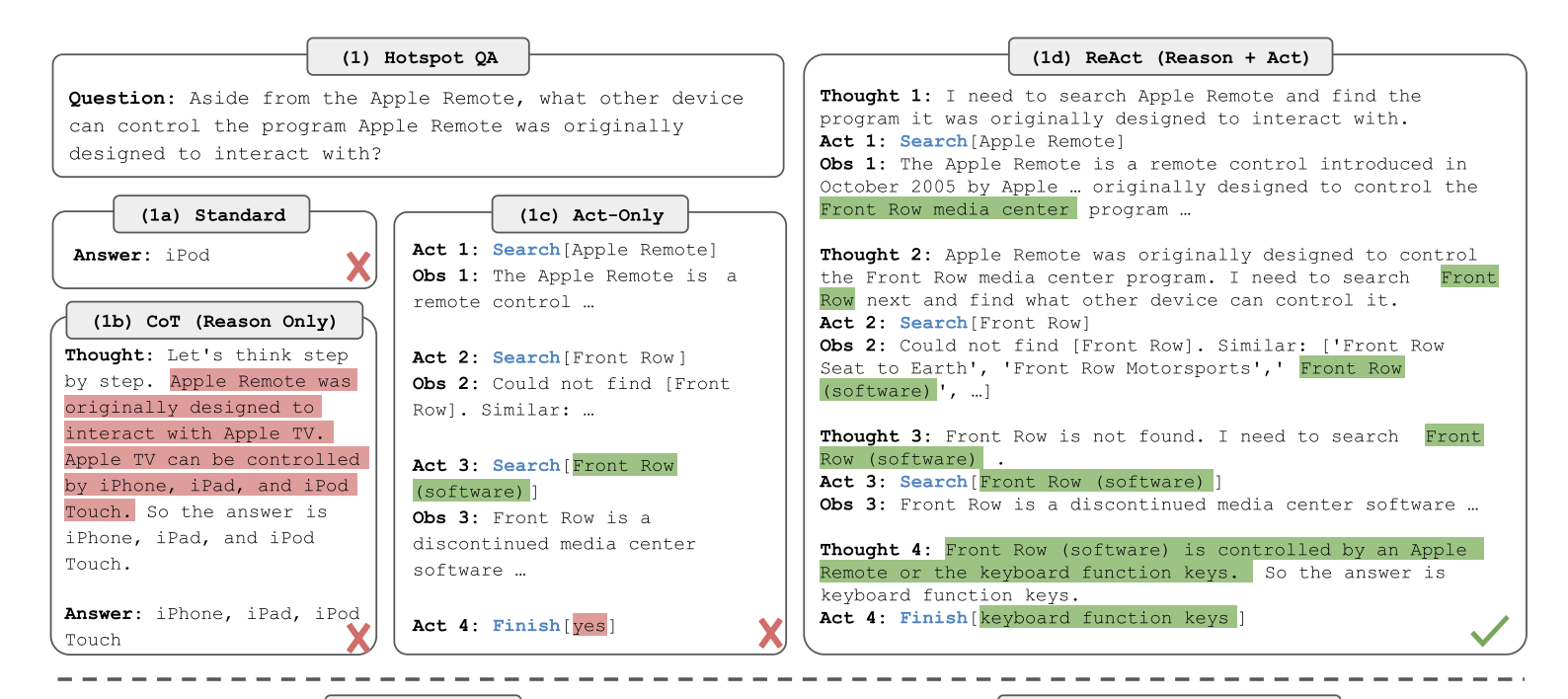 Action only prompt(Act): 移除所有 Thought,只保留 Action + Observation。只会执行动作(例如搜索),再根据反馈直接给答案,没有“语言推理轨迹”。 完全依赖外部信息;缺乏高层次计划,容易盲目尝试或陷入无效循环。
