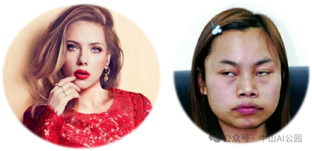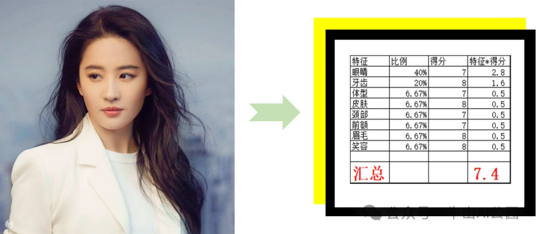 假如我们对一个需要评估的人提取了 6 个特征,分别是“眼睛,牙齿,体型,皮肤,颈部,额头,眉毛,笑容”。而现在我们也拍脑袋给了每一个特征对应的权重(比例) ,并且给定一个评分机制,从 0 分到 10 分进行打分,当然这个机制是完全客观的,上图针对刘亦菲汇总得出 7.4 分,针对凤姐可能就是其他得分了。通过上述机制就可以实现输入一个人给出对应的评分结果。