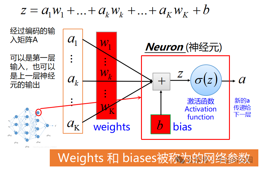每个神经元对收到的输入信号进行加权求和。简单来说,神经元对每个输入值乘以相应的权重,然后将结果加在一起。例如,对于神经元的输入向量 x1,x2,…,xn 和权重向量 w1,w2,…,wn,神经元的加权输入 z 为:z=w1⋅x1+w2⋅x2+⋯+wn⋅xn+b