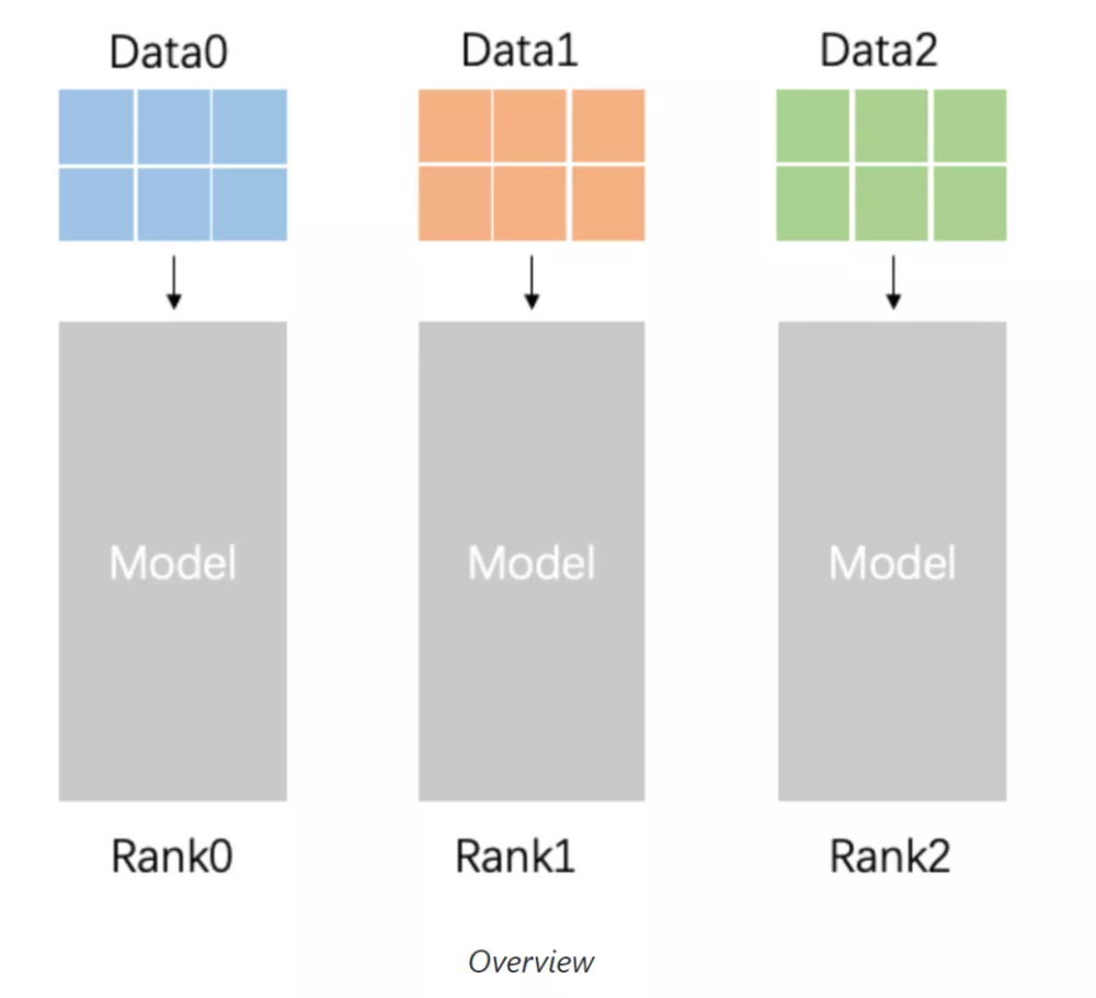 将数据划分到多张 GPU,每张 GPU 拥有完整模型副本,梯度同步更新模型参数。