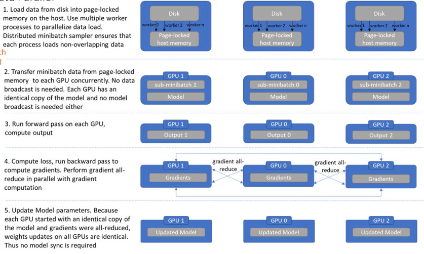 5.参数更新:每张 GPU 使用相同优化器同步更新参数。