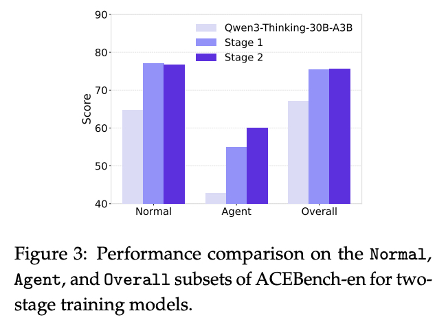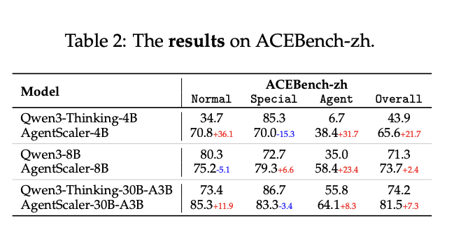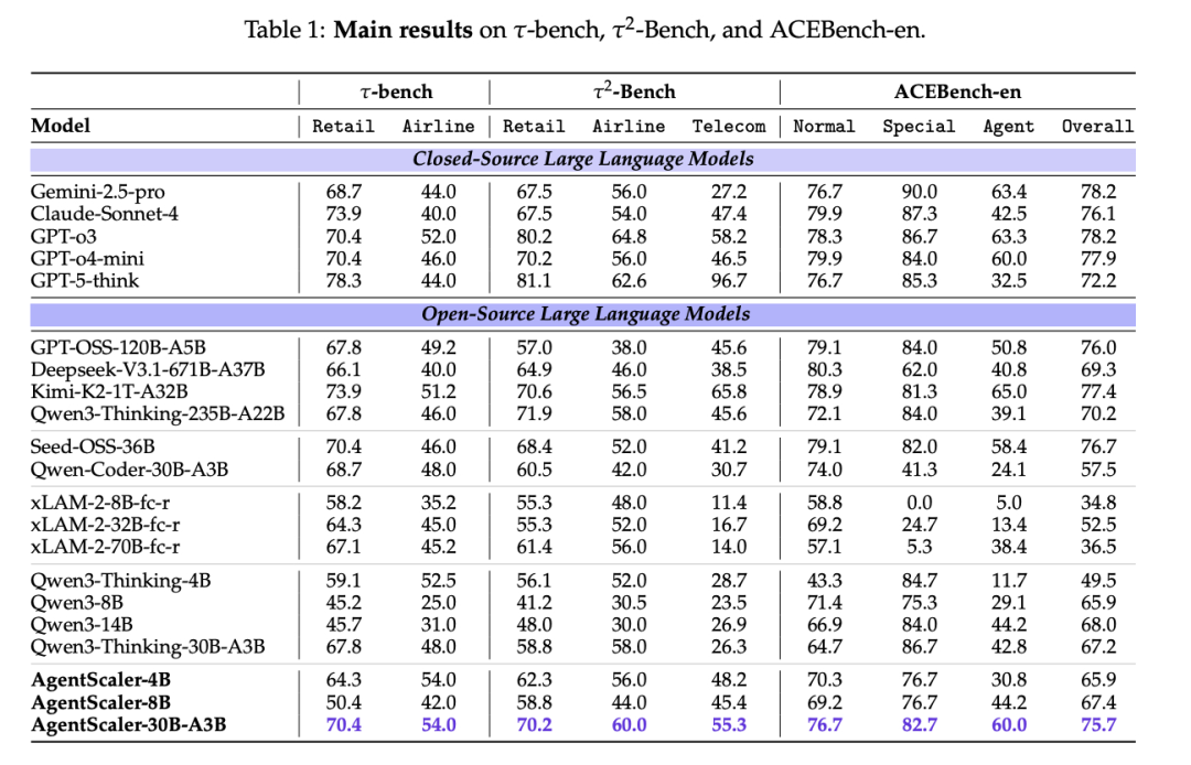 实验结果:4B 模型能与 30B 基线竞争;30B-A3B 模型在 <1T 参数下刷新了 τ-bench、τ²-Bench 和 ACEBench 的开源最优结果;稳定性在 pass^k 指标下提升,但随着工具调用次数增加,准确率有所下降