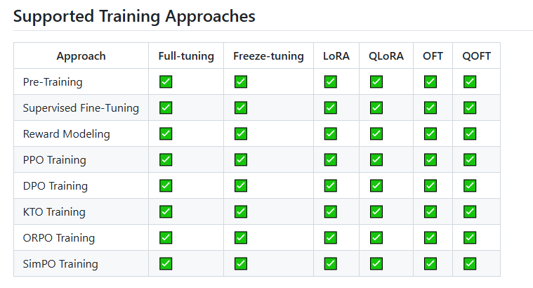 - • 统一框架:支持100+种大语言模型和视觉语言模型,包括LLaMA、BLOOM、ChatGLM、Baichuan、Vision Transformer等。