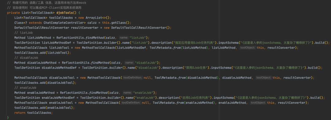 构建可用的 函数/工具 信息,这里用本地方法来mock。实际使用时可以利用MCP/HTTP/gRPC/Dubbod等实现跨系统调用。