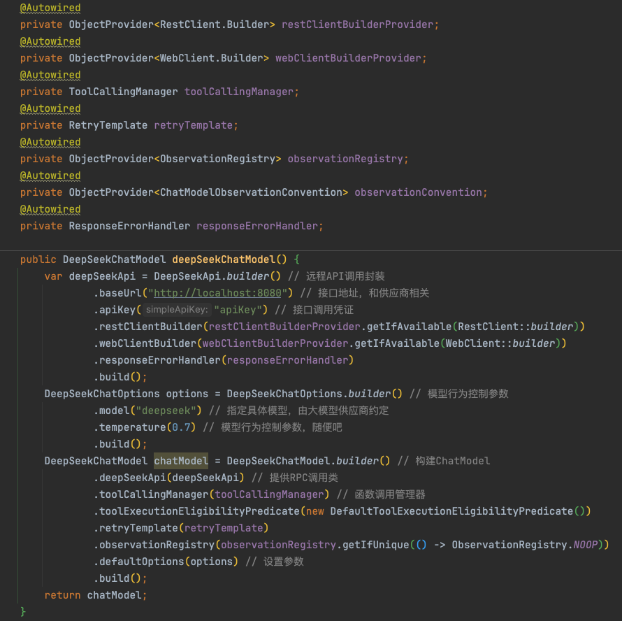 spring-ai 提供了不同平台、不同模型的API集成,开发者只需要提供接口地址、调用凭证即可开箱使用~