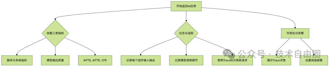 监控AI应用,不仅要看系统稳不稳定,还要看模型输出好不好,同时要有完整的日志和追踪,才能快速发现问题并定位原因。
