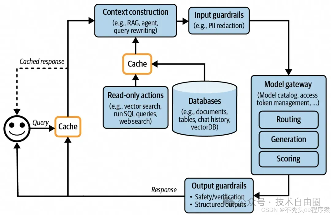 此文, 从最简单的用户和AI直接对话开始,逐步加入了一些关键功能,比如上下文增强、输入输出保护、意图识别、模型调度、缓存机制、智能代理(Agent)模式、监控日志以及性能优化等。