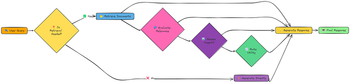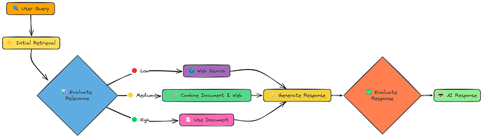 **纠正性 RAG(Corrective RAG,CRAG)**技术为我们提供了一个解决方案。它在检索之后,对检索到的信息进行评估,根据评估结果动态调整检索策略。如果检索到的信息质量高,系统会直接利用这些信息生成回答;如果检索到的信息质量低,系统会转而进行网络搜索;如果检索到的信息质量中等,系统会结合文档信息和网络搜索结果生成回答。