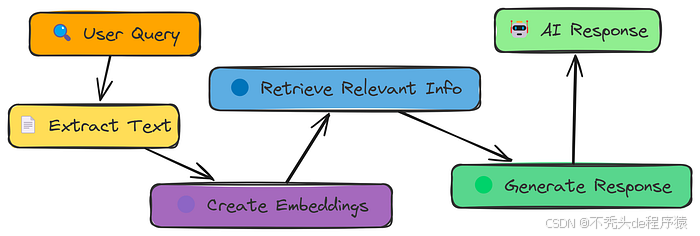 在探索各种复杂的 RAG 技术之前,我们先从最简单的 RAG 方法说起。**简单 RAG **的工作流程非常直观:从 PDF 文档中提取文本,将其分割成小块(chunks),将这些文本块转换为数值化的嵌入向量(embeddings),根据查询(query)搜索最相关的文本块,最后利用检索到的文本块生成回答。