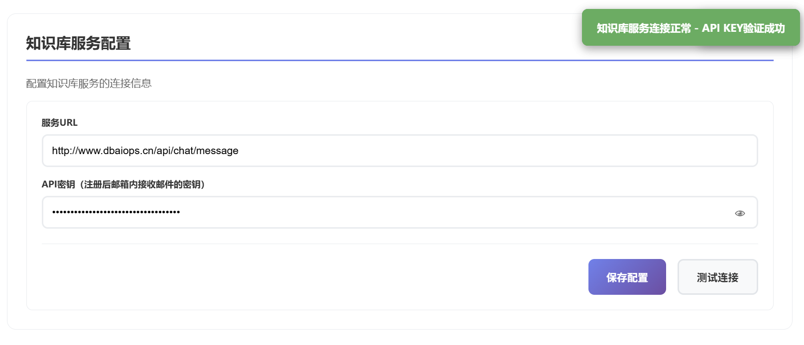 Step 2:知识库服务配置。在知识库服务配置页中填写获得的 API Key,确认连接到知识库服务。