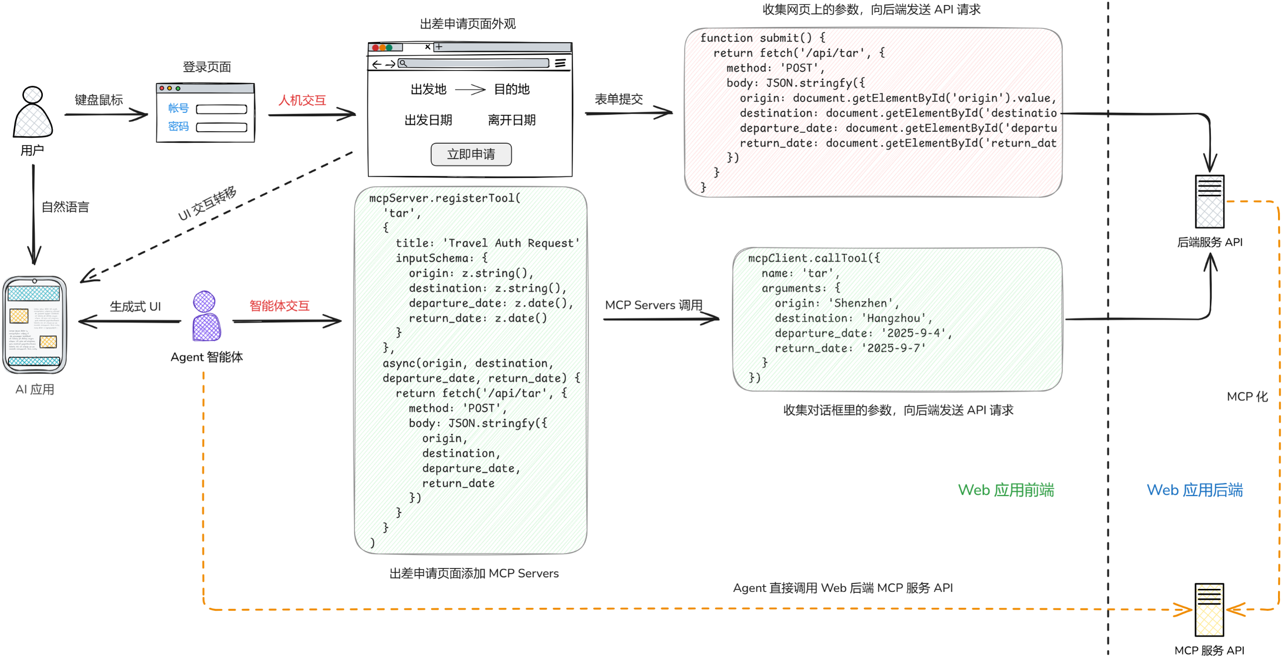 开发者在出差申请页面中添加脚本,通过 mcpServer.registerTool 定义 MCP 工具(参数包括出发地、目的地、出发日期、离开日期),工具的回调函数也调用相同的后端 API,与 submit 方法类似。用户在 AI 应用中以自然语言提出需求,智能体理解意图后通过 mcpClient.callTool 调用该工具,参数由智能体解析自然语言获得。这是智能体的交互流程。