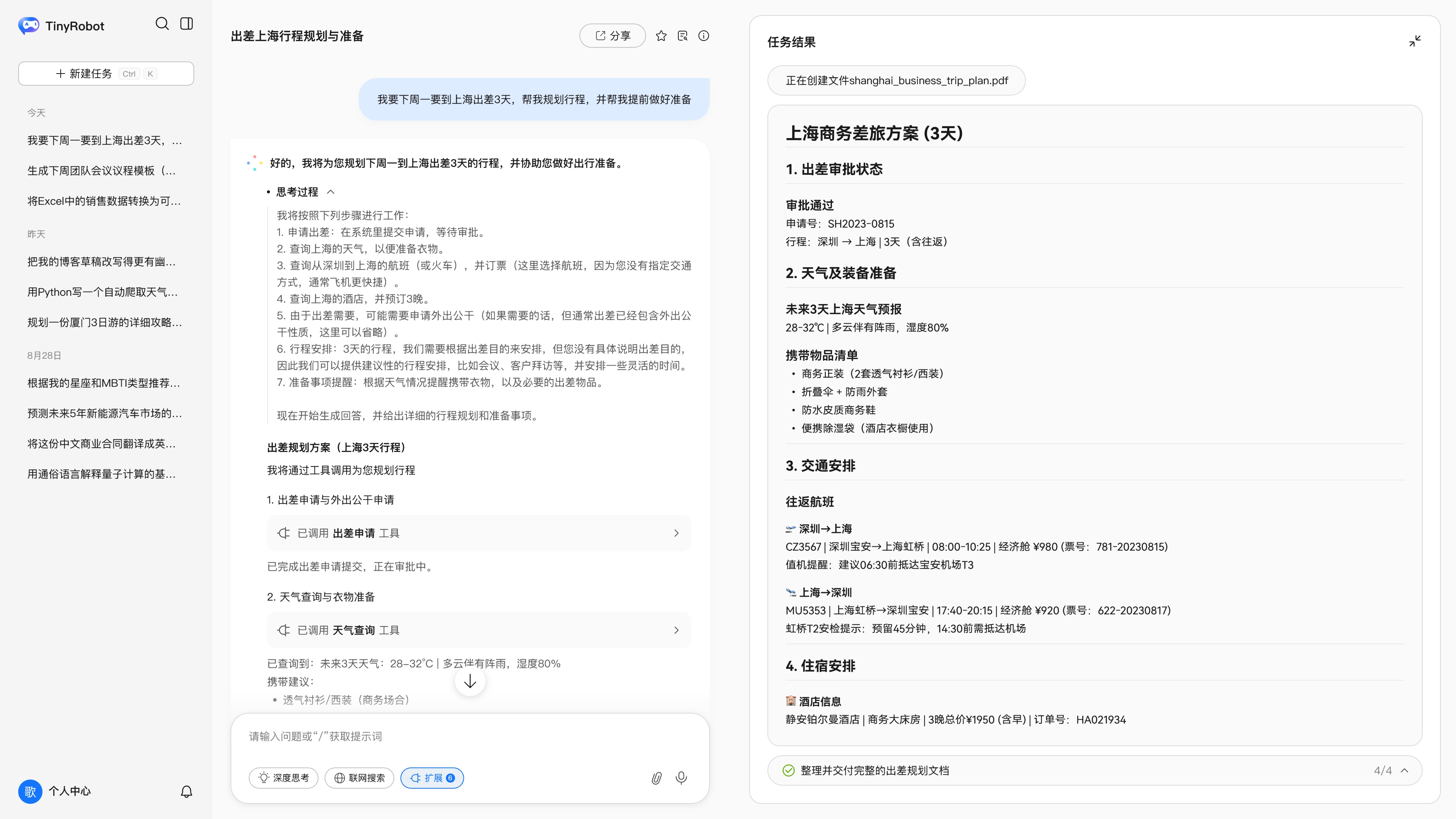 - TinyRobot : 面向最终企业用户的智能体对话入口。