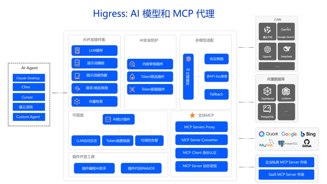 Higress 是 AI 网关的核心角色。中间的这块东西就是我们的 AI 应用和模型之间有一个核心的 AI 网关的代理能力,它可以做到一些核心的 AI 能力,比如 LLM 缓存,向量的一些检索,还有像 token 的一些限流。在安全方面包括一些协议的适配,我可能要去适配多个 OpenAI 模型的协议,以及 API 的统一管理。然后最近在做的主要就是 MCP 代理的这块,就是怎么把一些私有化或者公共的 MCP 服务统一地暴露给 Agent,并且做一些细粒度的认证,以及动态发现等一些能力。另外,协议转换也是比较重要的一块能力,就是把一些传统的 OpenAPI 的协议转成标准的 MCP 协议,都是可以通过这个 AI 网关和 MCP 网关来承接的。