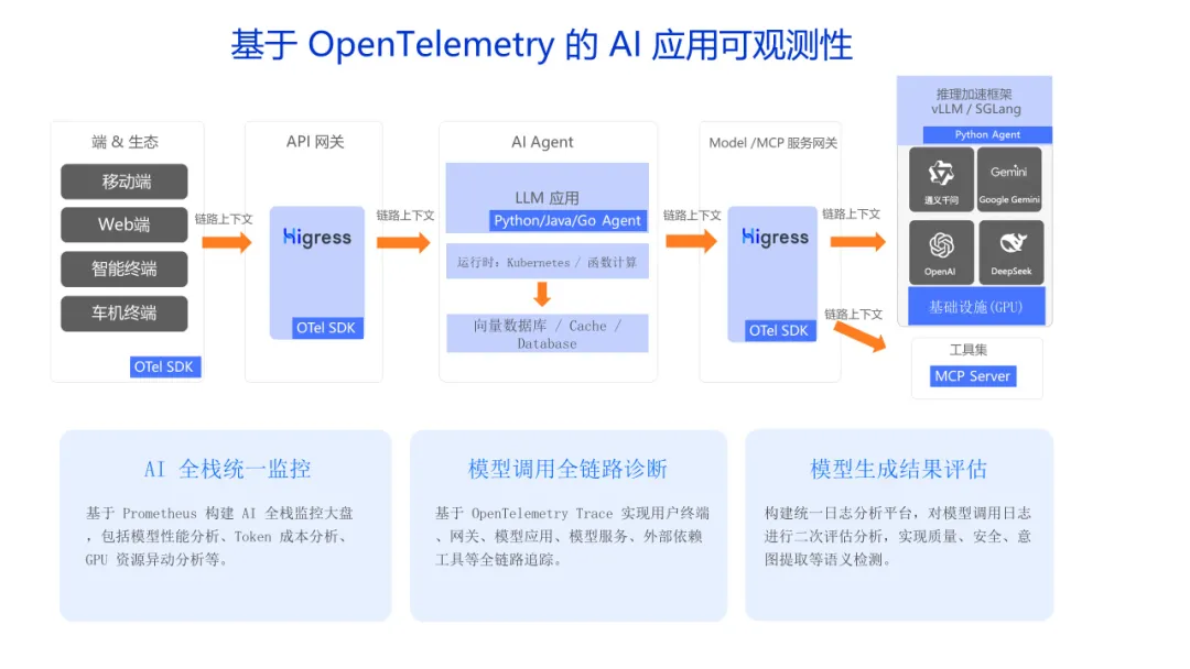 这里我们通过 OpenTelemetry 开源的标准,它这里面既包括了开源的 SDK ,也有提供的探针的方案。就是说把一些探针动态地挂载到这个 AI 应用里面。例如像 Java、Python 构建的这些 AI 应用,都可以通过探针挂载到这个应用里面去,它能够动态地采集上述的可观测数据。另外,在模型侧,我们发现很多模型都是通过 vLLM、SGLang 这种推理加速框架去拉起来的模型,它其实也是个 Python 应用,我们可以把探针挂载进去,采集在模型内部的推理的一些流程和细节的信息。同时在 GPU 层面,也可以去采集这些 GPU 的使用率等信息。有了这些数据的话,我们可以进行上述的三个处理。