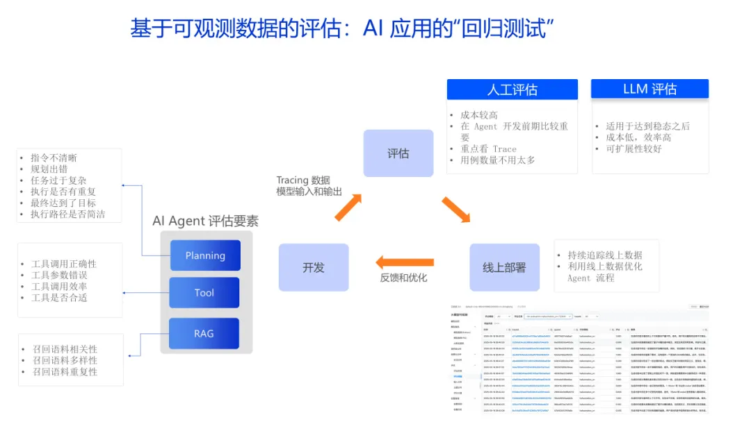 我们在开发阶段开发出 Agent 之后,通过 tracing 记录模型的输入输出,对它进行初步评估。这个评估有两种类型,一种叫做人工评估,它比较适合在 AI 应用开发的前期去进行。需要人为核对 AI 应用的结果是不是符合预期。首先挑选一些固定的 case,我们明确知道这个模型的返回结果的那种 case,然后人为地去评估这个运行的结果是不是满足预期。当到达一定的稳态以后,我们可以把它转为 LLM 评估,就是用第三方的模型来帮我们进行评估,这样的话可以更好的提升扩展性和效率。这个流程从评估完成以后到线上部署,我们会线上持续地去追踪这个线上的数据,就刚才说的指标 tracing 以及日志等等一些能力,去反馈和优化我们的 Agent。然后再通过 Agent 的不断地去迭代,循环往复。