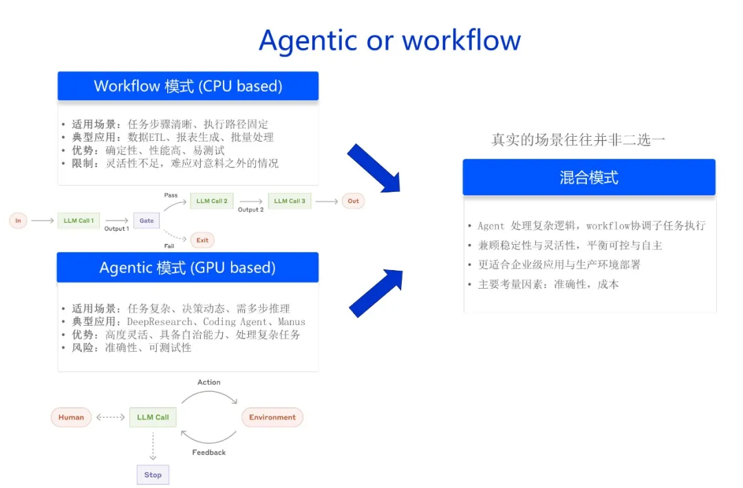 Workflow 模式其实很简单,我们在编排业务时把一些固定的流程,通过预定义的步骤,通过低代码或高代码平台的方式编排出来。好处就是确定性很高。传统的业务流程、一定不能出错或者确定性强的业务流程,我们可以通过这种模式进行。但在面对复杂场景或任务时,Workflow 就会显得捉襟见肘。比如需要完成非常高不确定性任务的 Agent,会不知道某环节的下一步该怎么走,在这种场景下,可以通过 Agentic 模式,通过大模型来告诉你下一步应该如何执行,完成规划和执行。好处就是灵活性会比较高。比如说现在常见的 Deep Research,还有 Coding Agent,使用的就是 Agentic 模式。