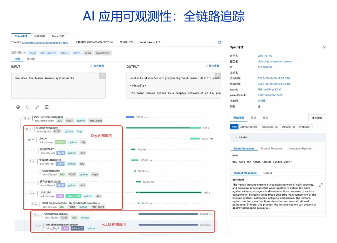 刚才说了指标,另外一个重要方面是 Trace。它能够帮我们非常清晰地看到模型推理调用内部一个实时的运行状况到底经过了哪些节点。在这里怎么看呢?比如说我们通过标准的 OpenTelemetry 的 Tracing 协议,可以采集到每个关键的环节。这个截图里面使用一个 Dify 构建起来的一个 workflow,去调用一个 vLLM 的一个模型。那么通过这个调用链,可以看到它的时间,总的 token 消耗以及它的 input 和 output 是什么。每一个 Dify 下面的 workflow 的关键节点信息,以及它的耗时分别是什么。因此我们可以看到耗时比较长的是在这个 LLM 调用这个阶段,在这个阶段它的 token 消耗是这么多,然后再到模型内部,通过全链路追踪的能力,把模型内部的调用过程也会反映出来。通过这个 trace 能够准确地看到每一次执行的情况。