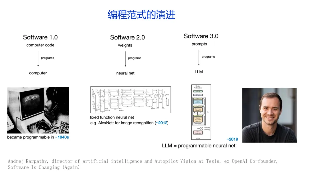 随着技术与发展,编程范式不断演进。OpenAI 前创始人,特斯拉自动驾驶负责人 Andrej Karpathy 在提出过类似观点。在软件 1.0 时代,我们通过计算机的编程语言对计算机进行编程,大家熟悉的 Java、Python 等语言都在做这个事情。在 2.0 时代,我们通过神经网络参数权重的调整来对神经网络进行编程。