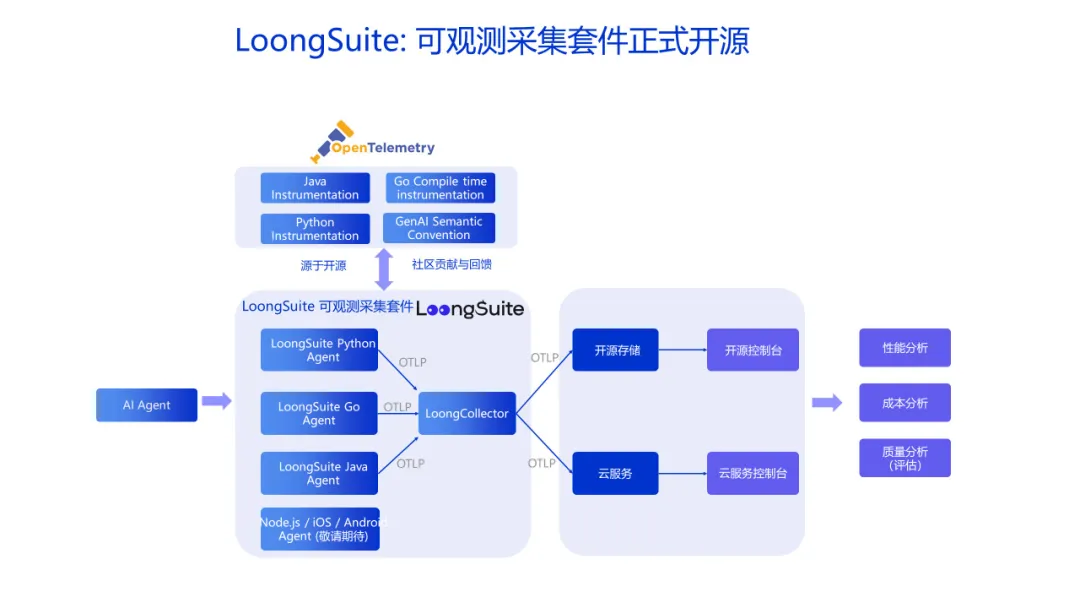 最近我们刚刚发布了开源项目 LoongSuite。Loong 是中文的龙的意思,Suite 是采集套件的意思,我们希望在开源的 OpenTelemetry 社区基础上,提供针对 AI Agent 开发所需要的各种框架的一些自动化采集探针能力。比如说有 Java 的,有 Go 的和 Python 的探针。这探针针对我们刚才说的用不同语言开发出来的 Agent,能够去自动捕获它的一些数据,包括指标 trace,还有日志 input、output 这些东西可以送到开源的一些存储,支持任何以 OTLP 协议,也就是标准的 OpenTelemetry 协议兼容的控制台,比如说 Jaeger 或者是 Elastic Search。这些也可以上报到云服务上面,通过云平台来帮你完成这些数据存储和展示以及托管。基于此来完成性能成本和质量分析与评估。