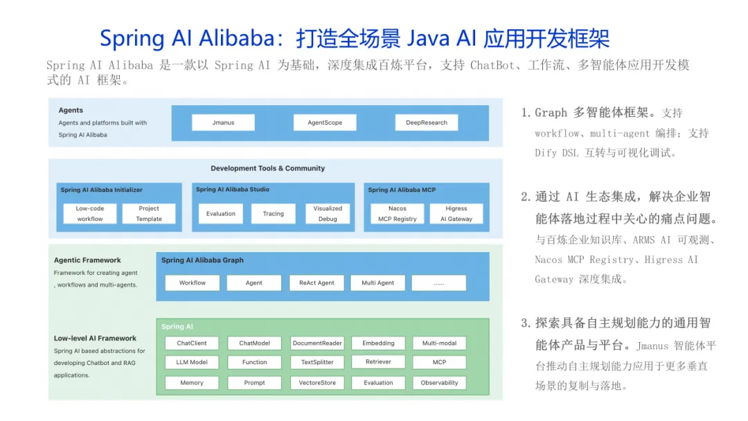 第一个 Spring AI Alibaba,它基于开源的 Spring AI 组件,封装了更多能力,比如支持 workflow、Agent 的模式,以及单 Agent 多 Agent 的一些抽象配置,帮助 Java 应用开发者去更好的开发 AI 原生应用。在此基础上,我们构建了更上层的业务场景,也就是通用的 Agent 叫 JManus,就是 Java 的 Manus 实现。还有一些典型垂直类的 Agent 场景,比如 Deep Research、Data Agent 等等。Spring Al Alibaba 对于 Java 开发者来说,是开发 AI 应用时,能立刻上手、功能相对完整的框架之一。