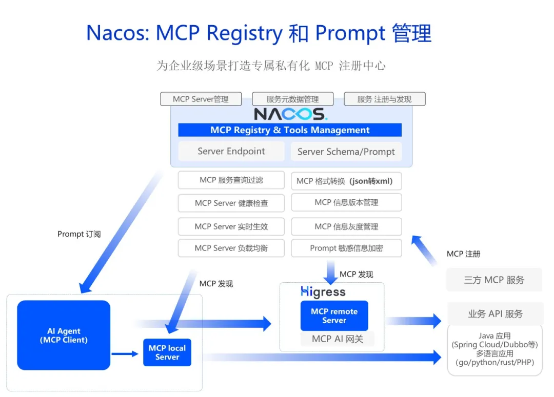 在 AI 原生应用场景中,Nacos 作为动态配置管理与注册中心的角色进一步延伸至 MCP 服务治理领域。当 Agent 需要访问传统微服务或第三方工具时,可通过本地启动的 Local Server 将服务转换为 MCP 接口,或通过远程 MCP Server 调用传统服务。对于涉及企业敏感数据或内部业务逻辑的 MCP 服务,需通过私有化部署的 MCP 注册中心实现统一管理。既满足了 AI Agent 对异构服务的灵活调用需求,又保障了企业级服务治理的安全性与可控性。