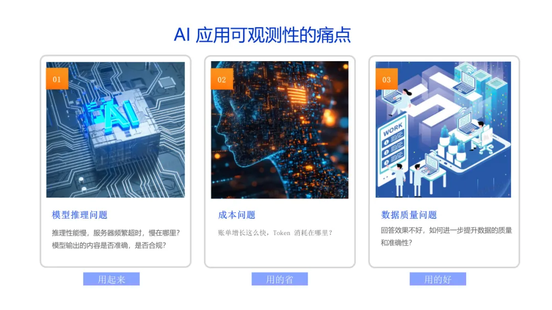 接下来是可观测性的一些介绍。在应用 AI 应用的开发过程中,总结下来可观测性有三大痛点。第一个怎么把它用起来,第二个是怎么用的省,第三个是怎么用的好。