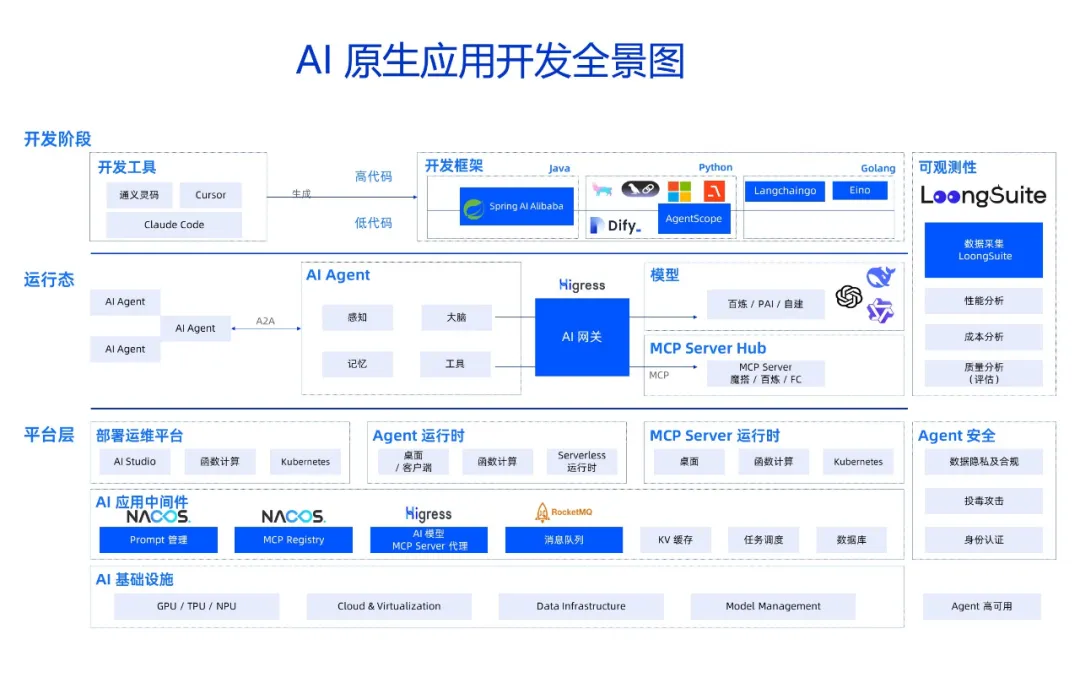 构建运行时环境后,Agent 的底层架构需依赖通用中间件能力以支撑核心服务。比如通过 Nacos 实现 Prompt 提示词的统一管理及 MCP(模型控制器)的动态注册与发现;通过 AI 网关对多模型和 MCP 实施集中代理;同时借助消息队列完成长周期、多阶段任务的异步化改造