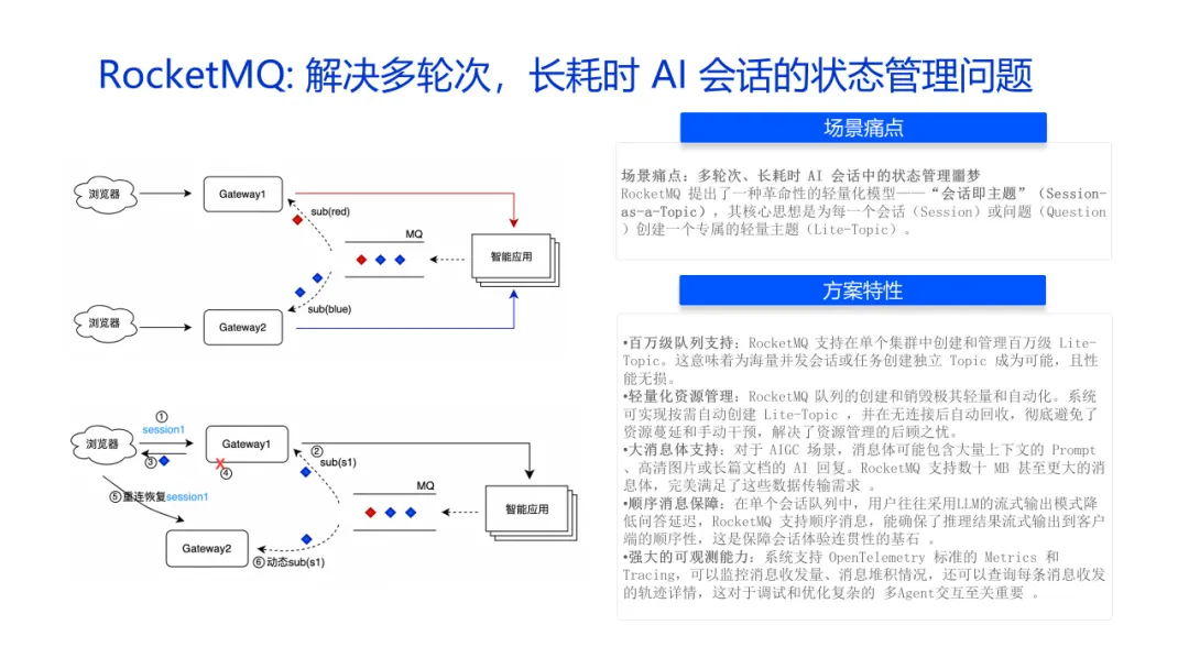 在 AI Agent 的复杂交互场景中,Apache RocketMQ 通过消息队列机制解决了多轮对话中的状态恢复与重试成本问题。当 Agent 与模型进行多阶段交互时,中间结果(如阶段性响应、流式输出)通常以临时状态形式存在,一旦网络中断或服务异常,传统架构需从头发起 GPU 计算的重试流程,其成本可能是 CPU 时代微服务场景的十倍以上。RocketMQ 创新性地将 AI 框架下的会话(session)映射为消息队列的 Topic,将所有中间状态实时写入队列存储。例如,网关作为消费者订阅该 Topic 并逐步将结果推送给客户端,若当前网关节点故障,系统可动态切换至备用消费者节点,新节点可通过订阅同一 Topic 获取已存储的中间数据,从而实现断点续传式的恢复能力。这种设计避免了 GPU 资源的重复消耗,同时通过消息队列的持久化特性保障了长周期任务的可靠性。