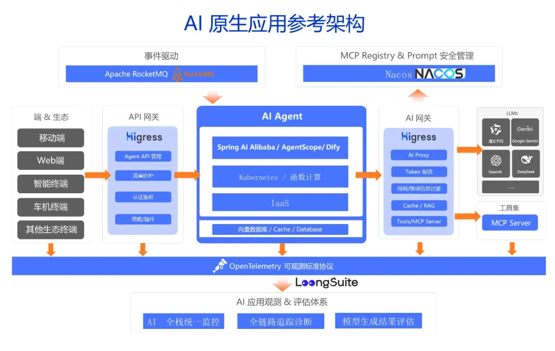 在解读完上面的三个问题,接下来介绍一下 AI 原生应用的参考架构。以 AI Agent 为核心,其运行依赖于多种技术组件协同。Agent 本身可通过不同开发框架构建,并部署于计算实例中,通过调用数据库或向量数据库获取外部数据支持决策。用户请求首先经过 API 网关接入系统,随后转发至 Agent 模块,该模块通过统一 AI 网关与模型进行交互。AI 网关作为关键代理,承担多模型调用的协议转换、token 限流等通用能力,尤其在多模型并存的场景下,有效协调不同模型接口的差异性。在模型交互过程中,它承担重要角色,通过 Nacos 实现对公有和私有服务的统一注册与动态提示词管理,确保模型调用的灵活性与可扩展性。对于涉及长周期处理的异步任务,系统依赖消息事件机制完成状态管理,通过事件驱动的方式解耦任务执行与响应流程。所有组件产生的可观测性数据(如性能指标、调用链路)均通过标准 OpenTelemetry 协议采集,由 LoongSuite 探针统一汇聚至可观测平台,用于实现系统诊断、模型效果评估及运行时优化。