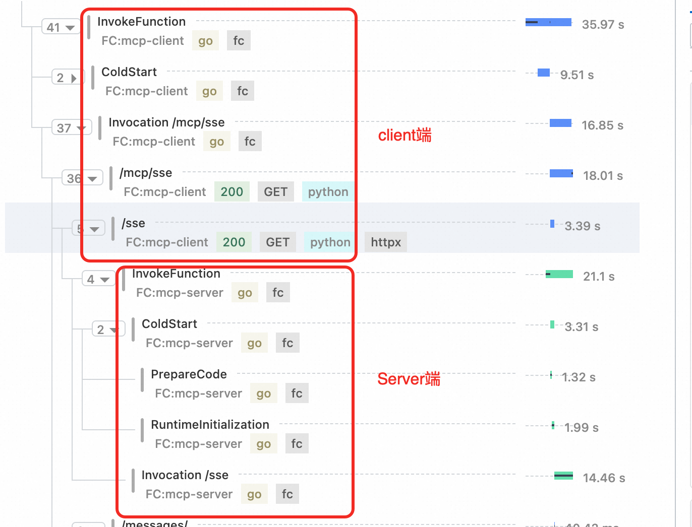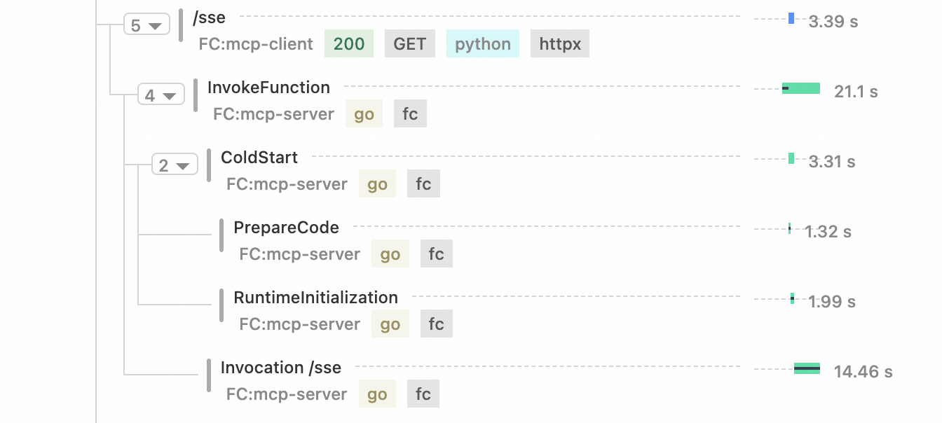 当函数计算作为分布式链路中的一环时,函数计算链路追踪可以串联上下游服务,看到请求在各个步骤的延时。串联 mcp-client 和 mcp-server 端。