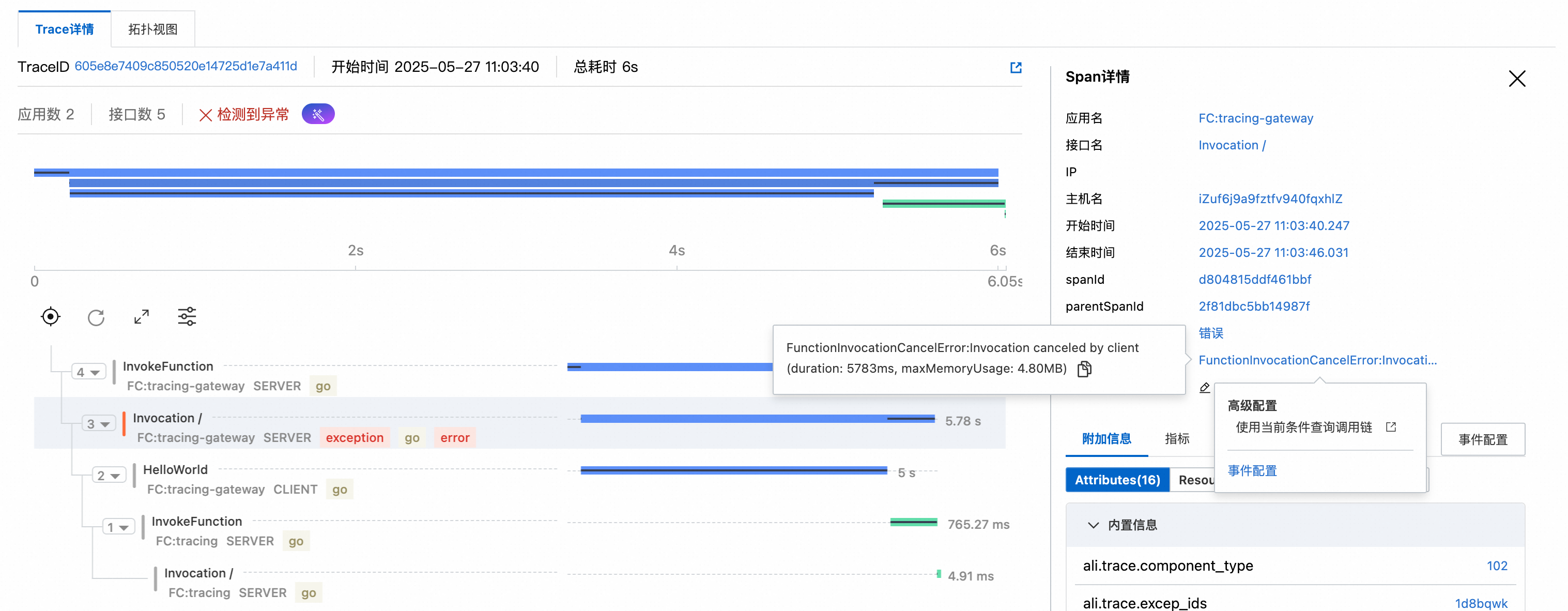 - FC 系统级 span 透传:将 FC 内部组件(如调度器、冷启动模块)的关键生命周期事件以 Span 形式上报,覆盖函数调用全流程(调度→初始化→执行→释放)。